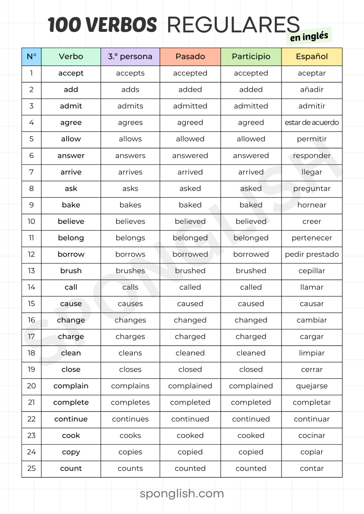 100 verbos regulares en inglés y español (PDF descargable + ejemplos)